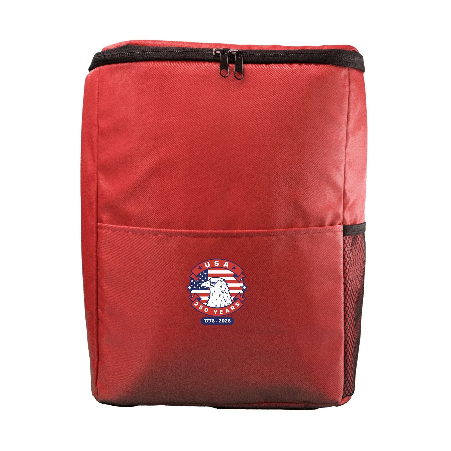 Experience the convenience of the insulated zippered cooler backpack with its easy-to-use full-top opening, allowing for quick and effortless access. This backpack is equipped with a roomy front pocket and side mesh pockets, ideal for storing snacks and ensuring they are always close at hand. With a patriotic design included, this backpack is not only functional but also stylish. Complies with Prop 65. 10″ L x 13″ H x 5.75″ W